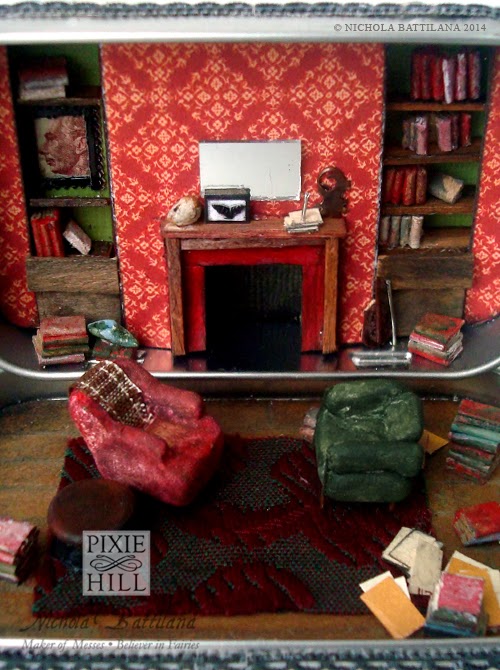 There's a lot going on in that little space. Some of the things that I've included are... a violin (very hard to see but you can just make out the bow to the right of the fireplace next to the stack of books), a stack of correspondence jabbed onto the mantle, a skull, famed specimen, a blue slipper for hiding ciggies (to the left of the fireplace), books galore, file folders, strewn papers, a framed portrait (in this case the face from a stamp).